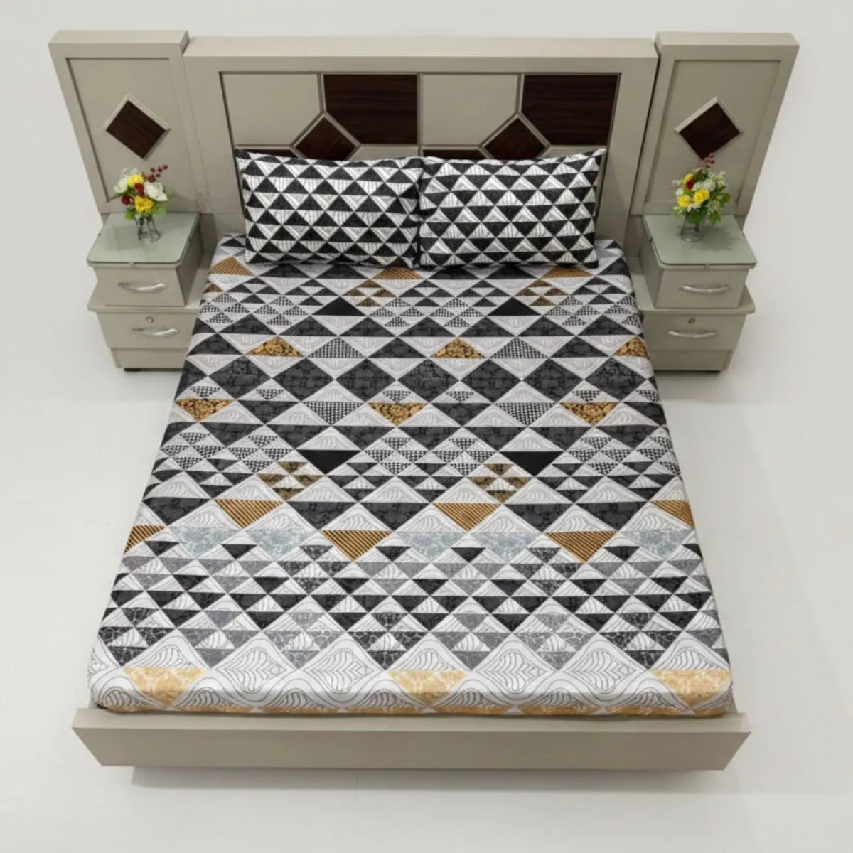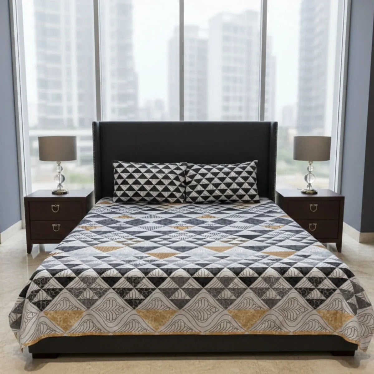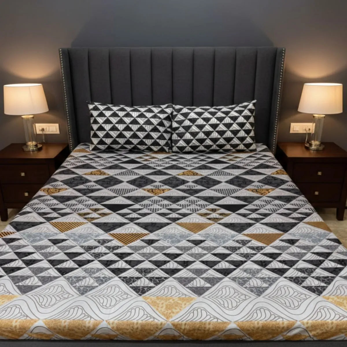 Bring modern elegance to your bedroom with this stunning geometric printed bedsheet. Designed with a stylish blend of black, grey, white, and subtle golden tones, the intricate triangle pattern creates a bold yet balanced look. The detailed mosaic-style layout adds depth and sophistication, making it perfect for contemporary interiors.