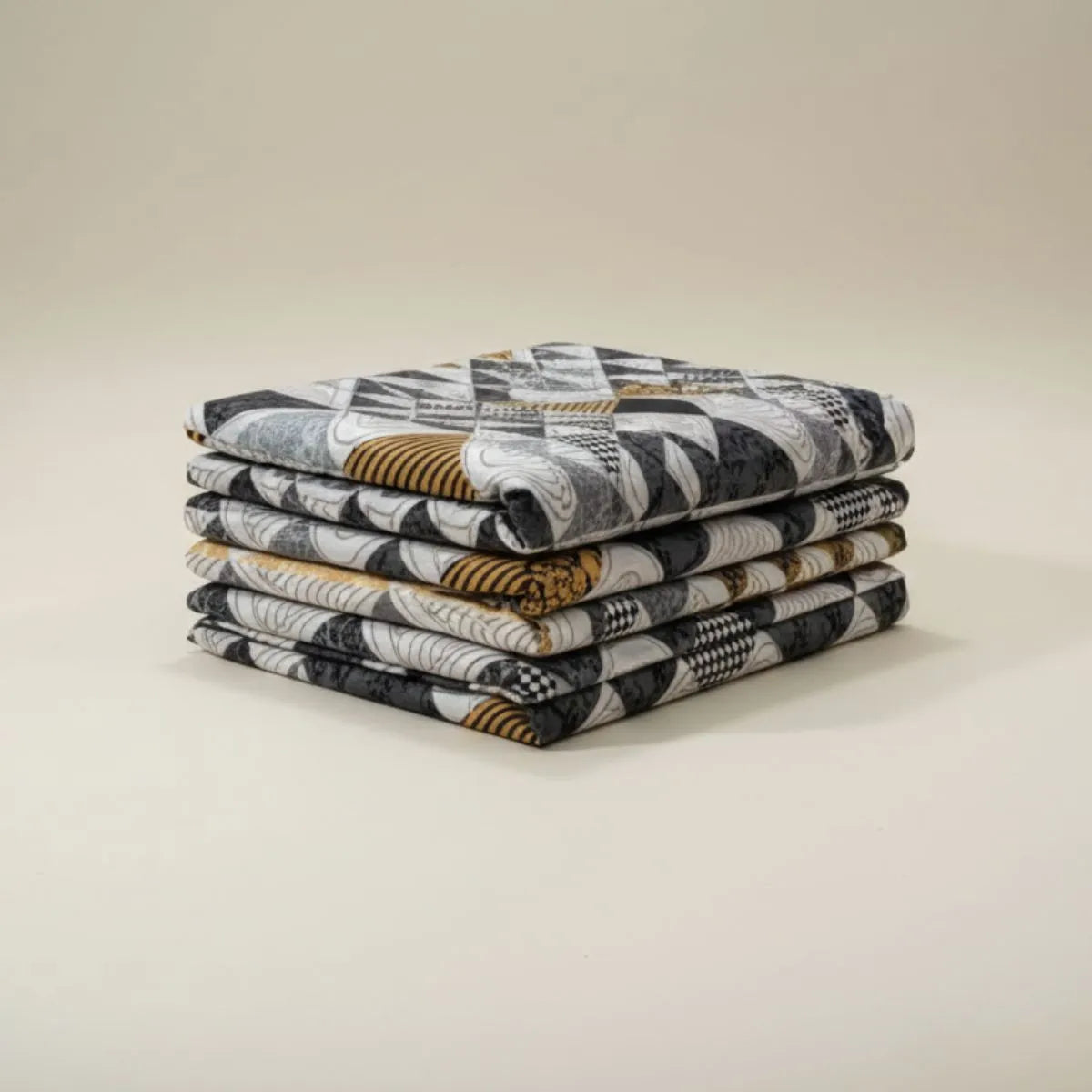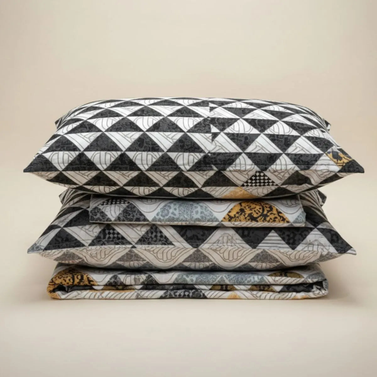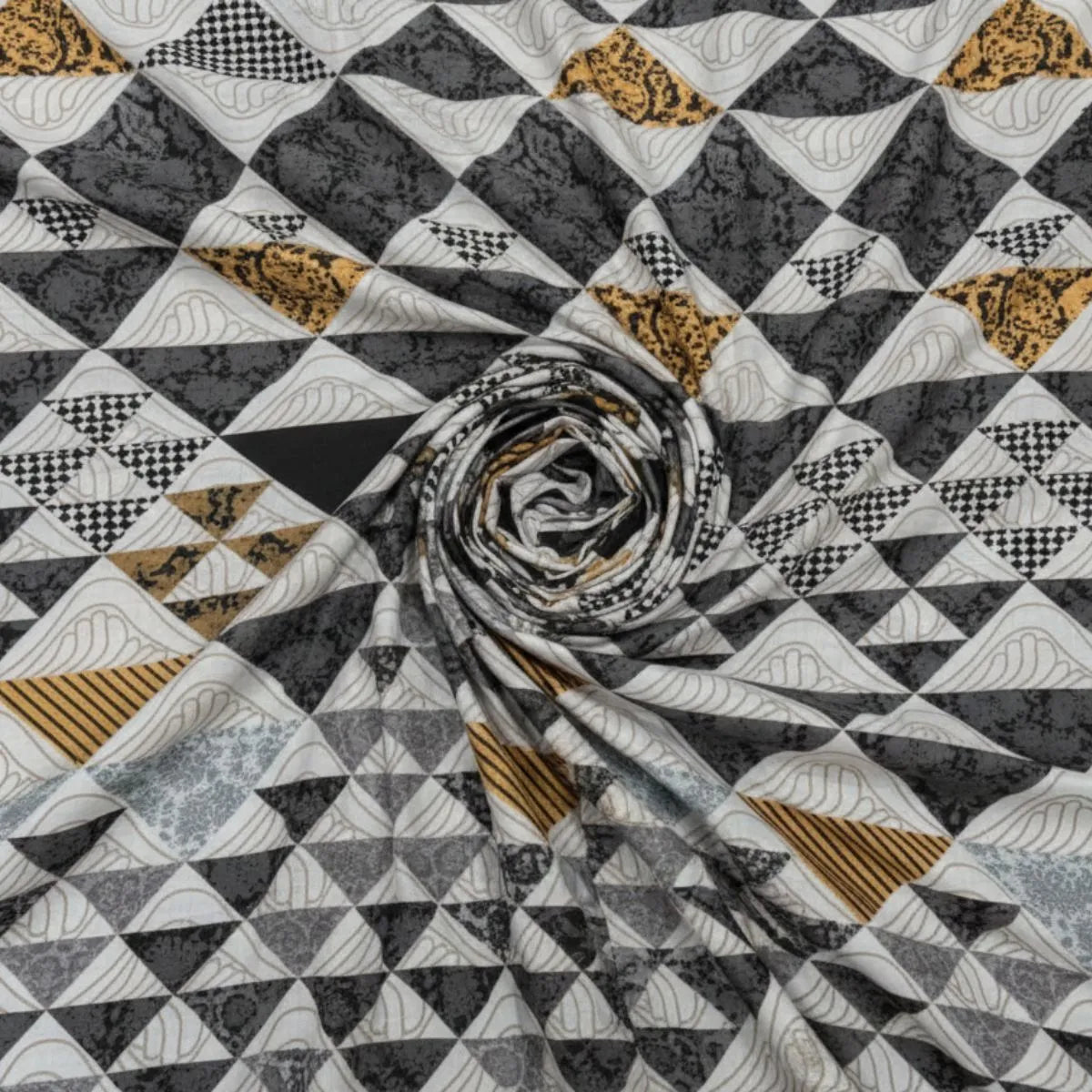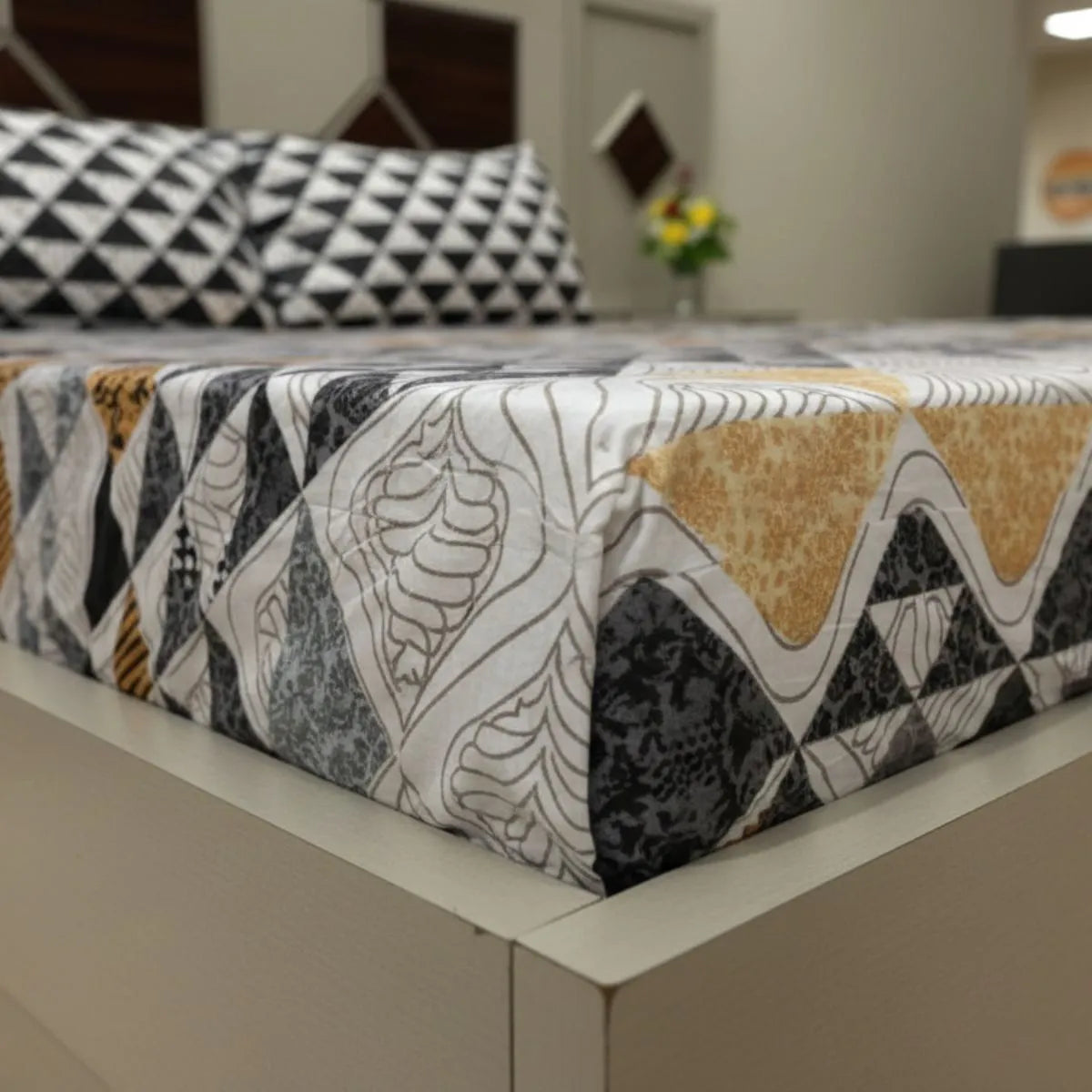 Bring modern elegance to your bedroom with this stunning geometric printed bedsheet. Designed with a stylish blend of black, grey, white, and subtle golden tones, the intricate triangle pattern creates a bold yet balanced look. The detailed mosaic-style layout adds depth and sophistication, making it perfect for contemporary interiors.