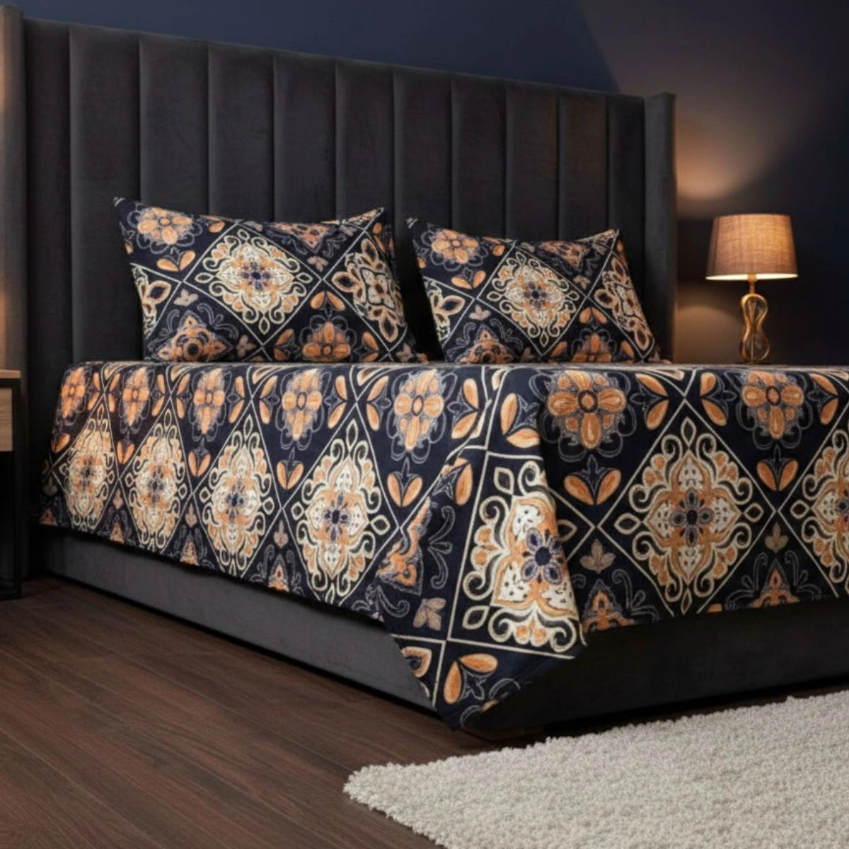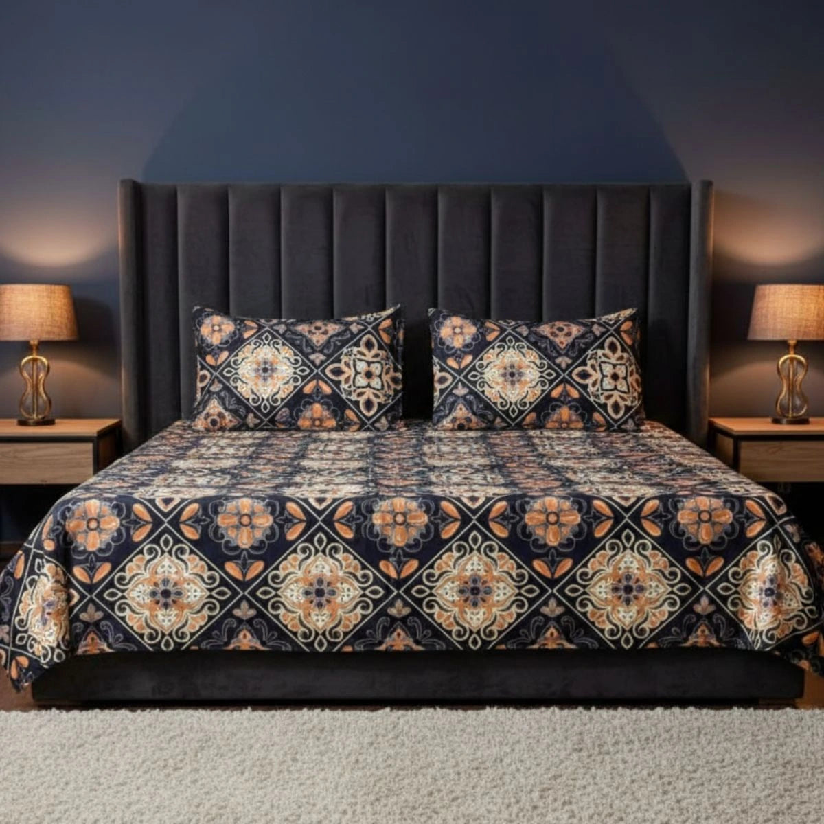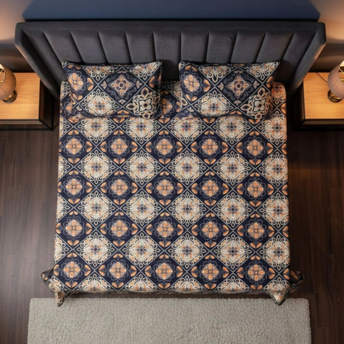 Add a touch of royal elegance to your bedroom with this stunning Midnight Royal Mosaic bedsheet. Designed with intricate floral and geometric patterns in warm golden and earthy tones over a deep dark base, this bedsheet creates a bold yet sophisticated look.