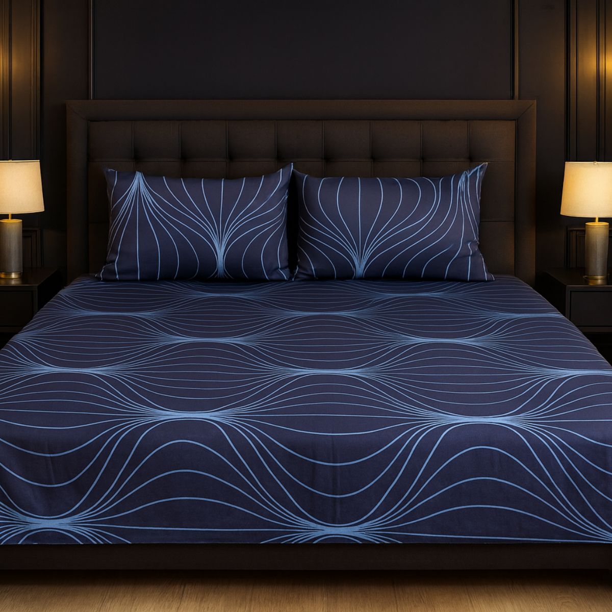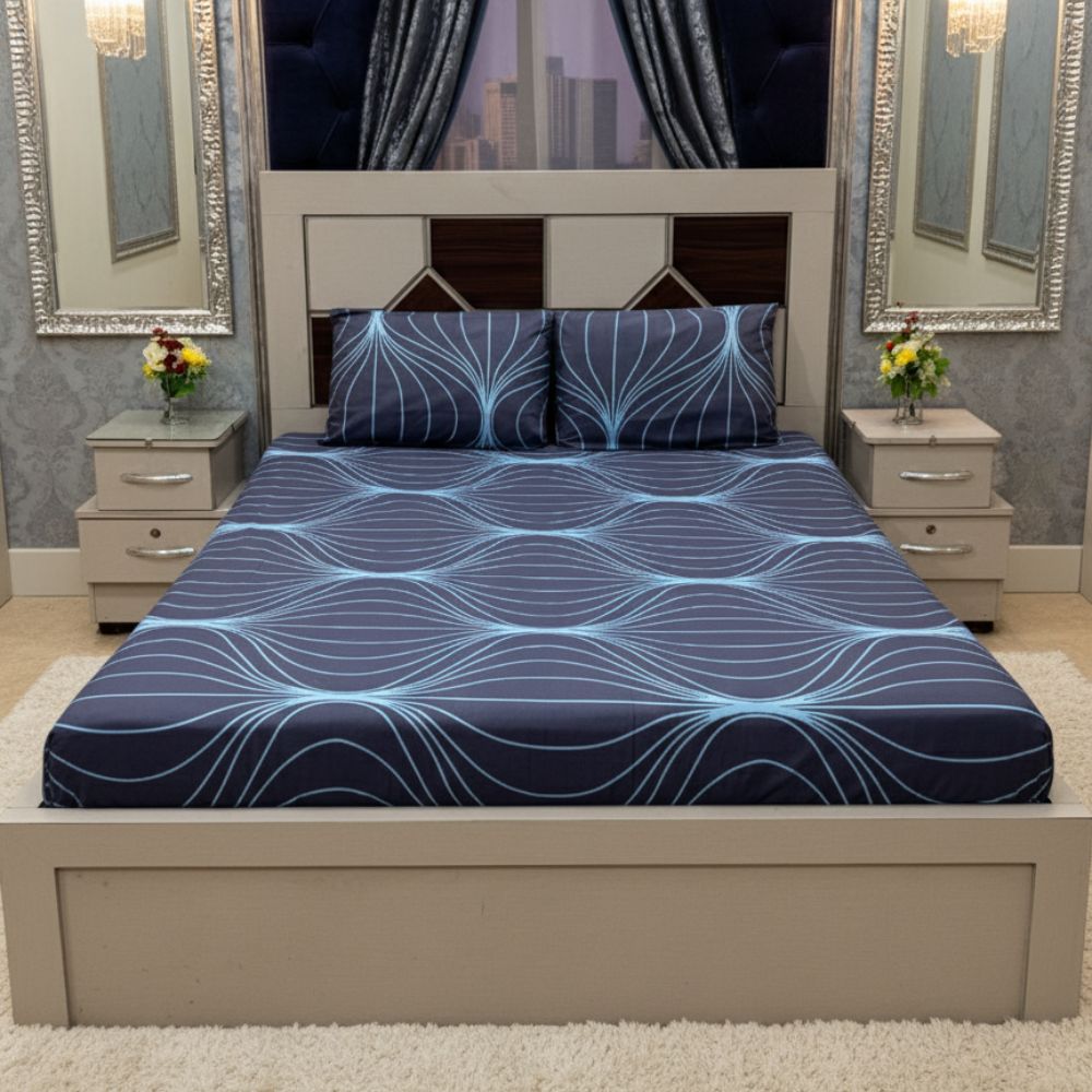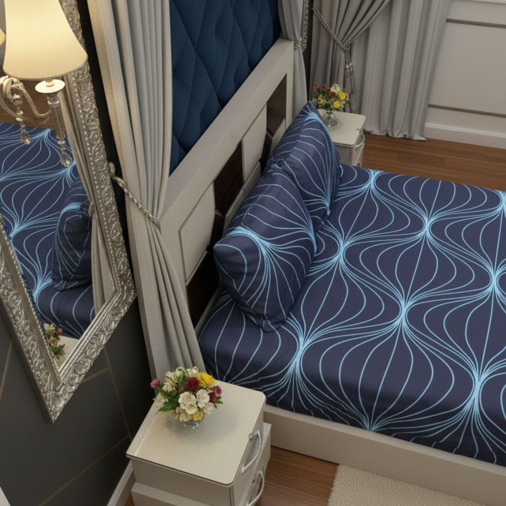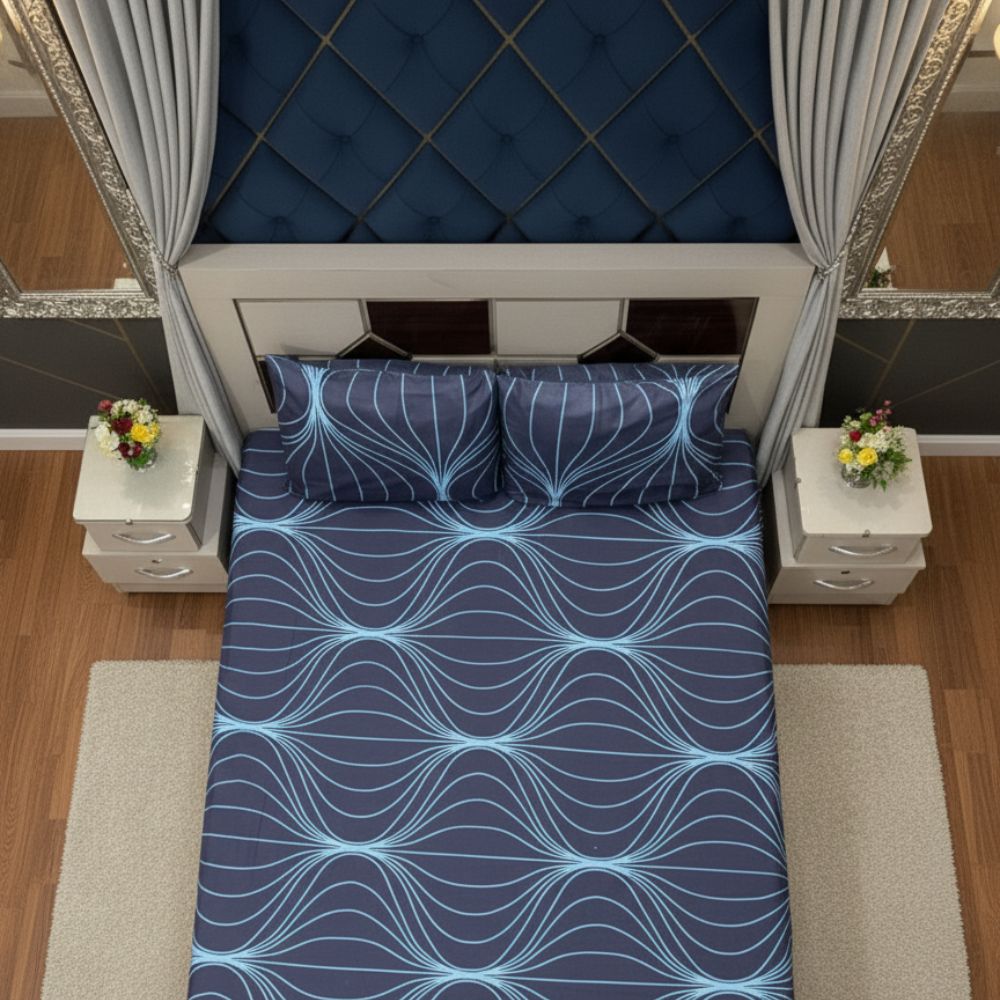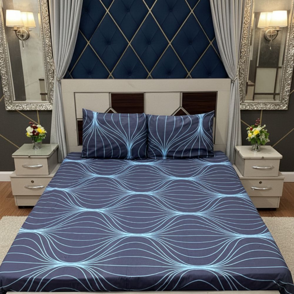 Bring calm and style to your bedroom with the Ocean Wave Elegance Bedsheet Set. Crafted from premium soft cotton, this bedsheet features a soothing navy blue base with graceful light blue wave patterns. Designed for both comfort and elegance, it adds a modern touch to any décor while ensuring a cozy sleeping experience. Perfect for everyday use or special occasions.