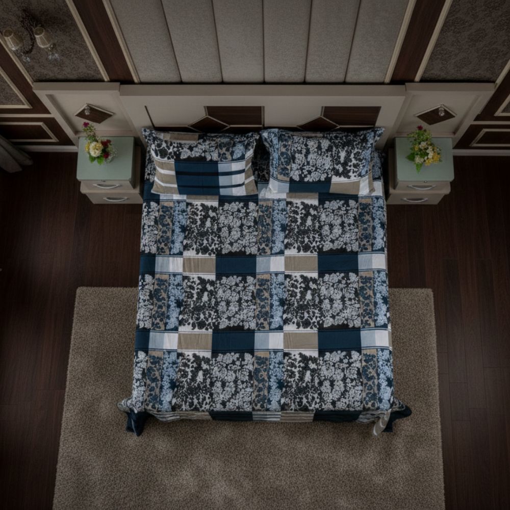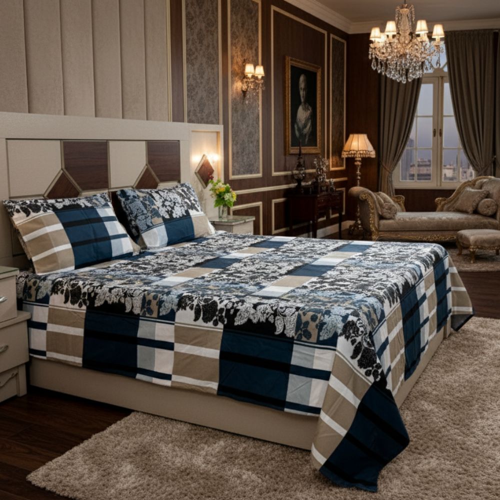 Add a touch of elegance and comfort to your bedroom with this stylish blue, beige, and white checkered bedsheet. The design beautifully blends bold geometric checks with intricate floral patterns, giving a perfect mix of modern and classic charm. Crafted from premium cotton fabric, this bedsheet offers a soft, smooth, and breathable feel for a restful night’s sleep. Ideal for all seasons, it enhances your bedroom décor with its graceful and versatile look.