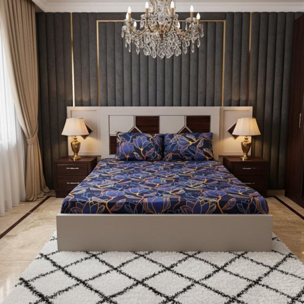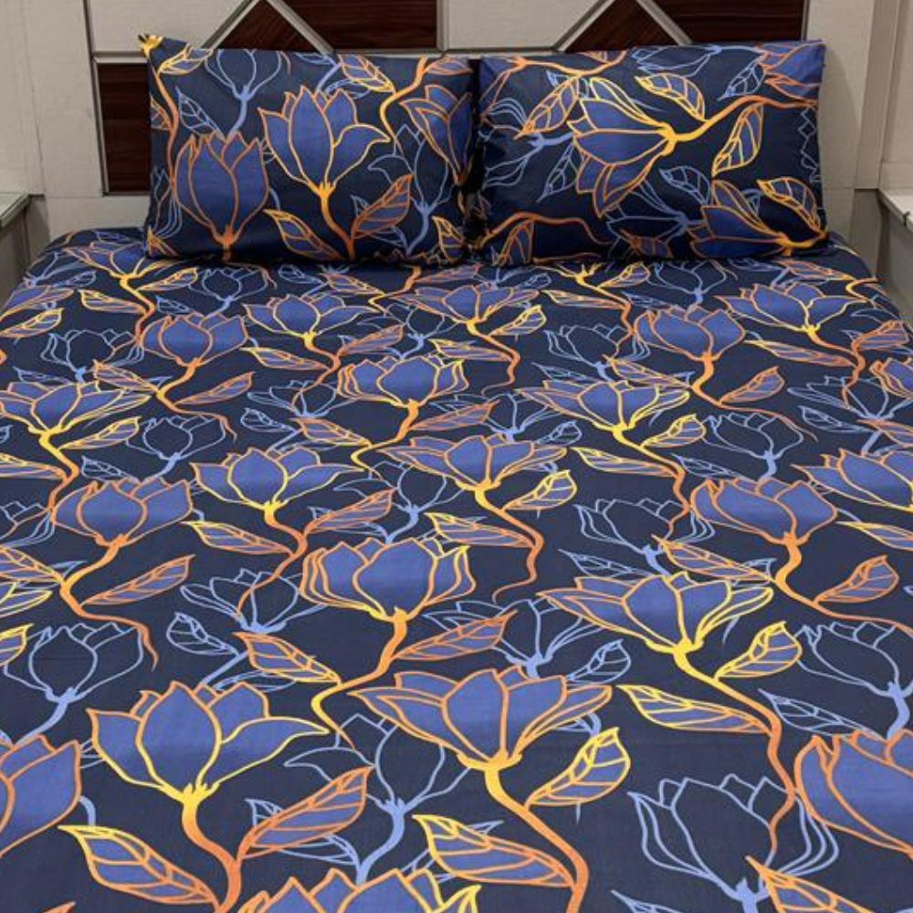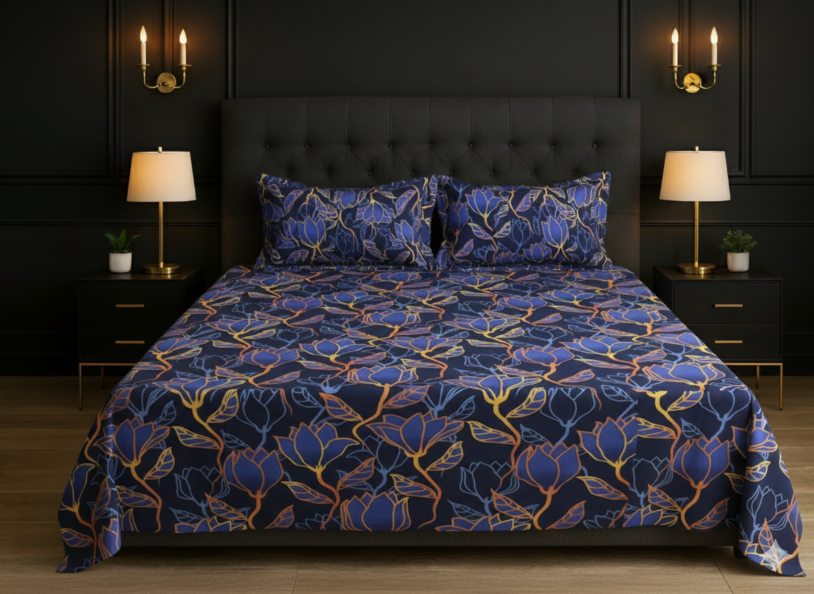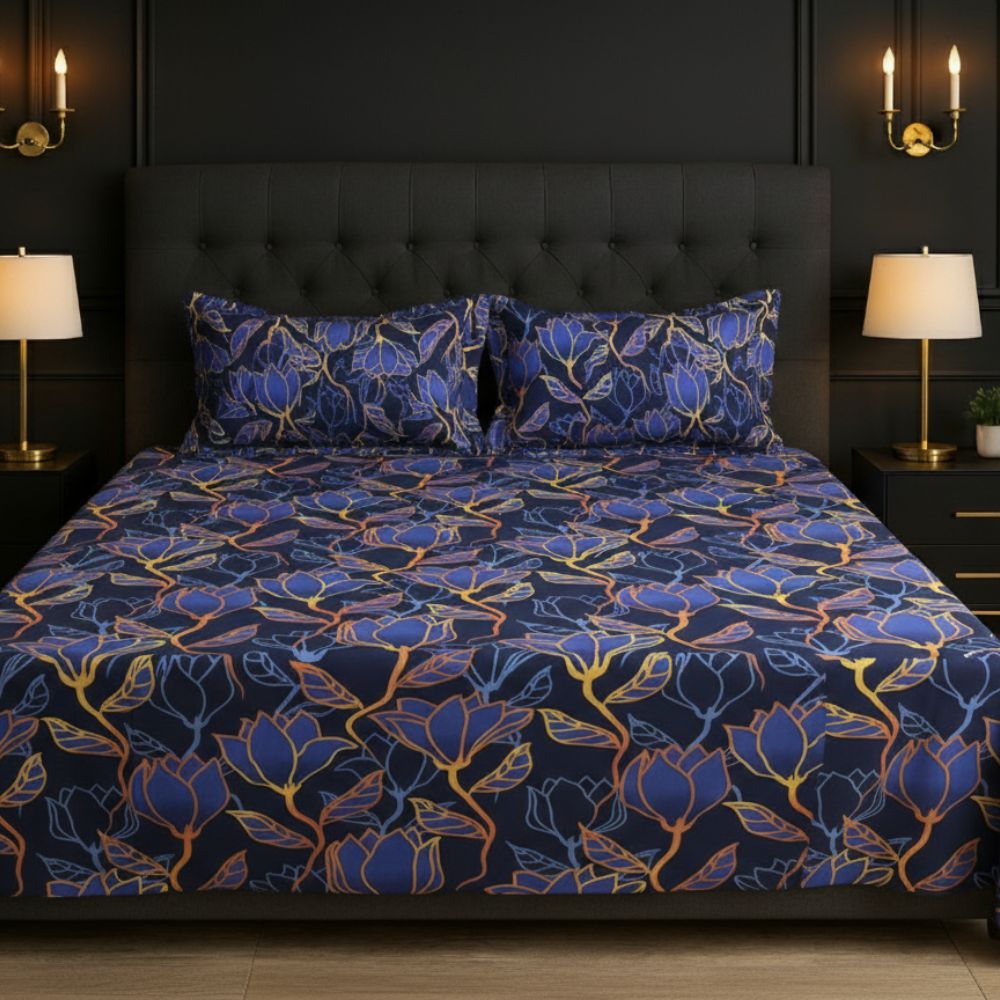 Transform your bedroom into a modern, elegant space with the Midnight Bloom Elegance Bedsheet. Crafted from premium cotton fabric, this bedsheet combines luxurious softness with stunning style. The bold floral pattern and deep, rich tones bring a touch of sophistication to any room decor.