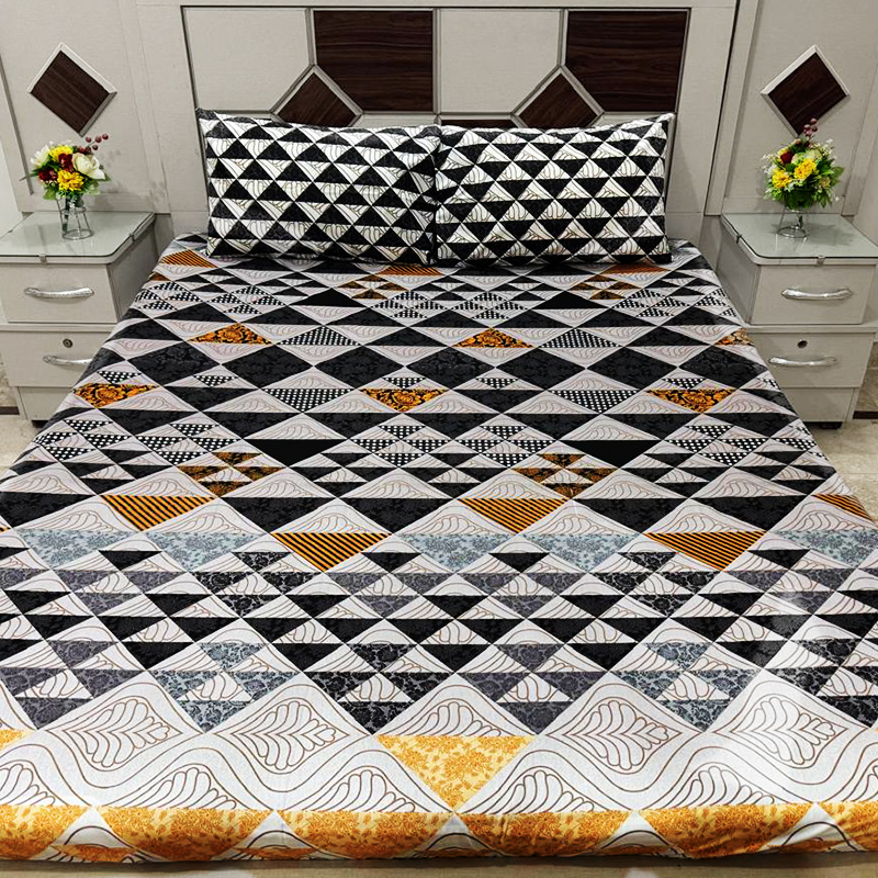 Bring a modern touch to your bedroom with this sleek geometric bedsheet set, featuring a stylish mix of black, white, and gold-toned triangles. Crafted from premium cotton, it offers a soft, breathable, and durable fabric for a comfortable and refreshing sleep. Perfect for adding a contemporary charm to any space.