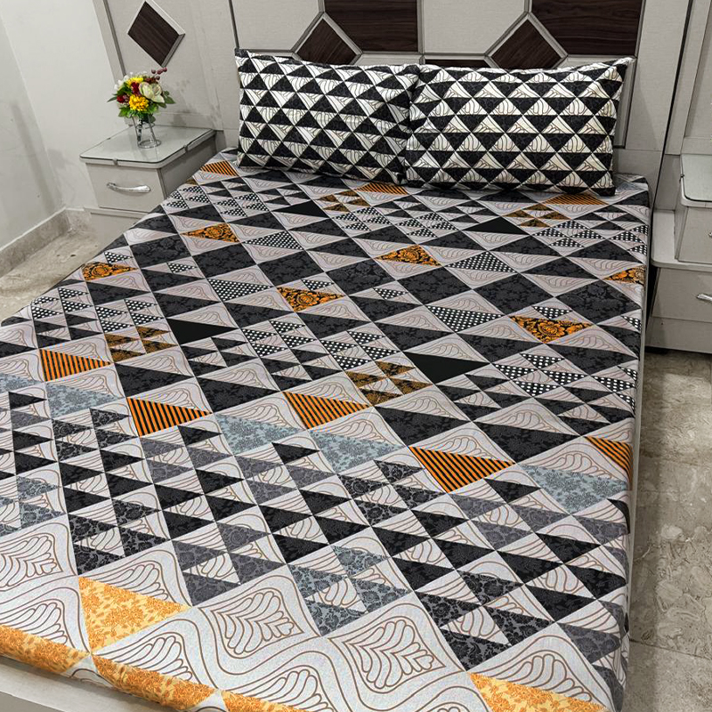 Bring a modern touch to your bedroom with this sleek geometric bedsheet set, featuring a stylish mix of black, white, and gold-toned triangles. Crafted from premium cotton, it offers a soft, breathable, and durable fabric for a comfortable and refreshing sleep. Perfect for adding a contemporary charm to any space.
